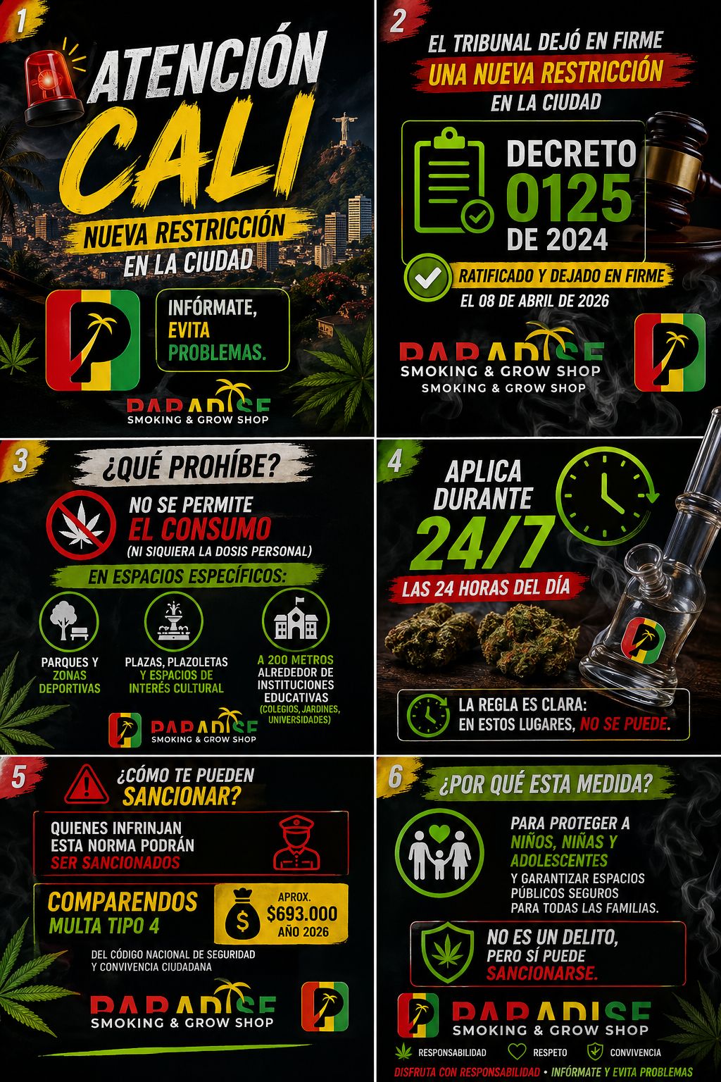 Esta normativa aplica las 24 horas del día (24/7) e incluye zonas como parques, espacios deportivos, áreas culturales y alrededores de instituciones educativas.